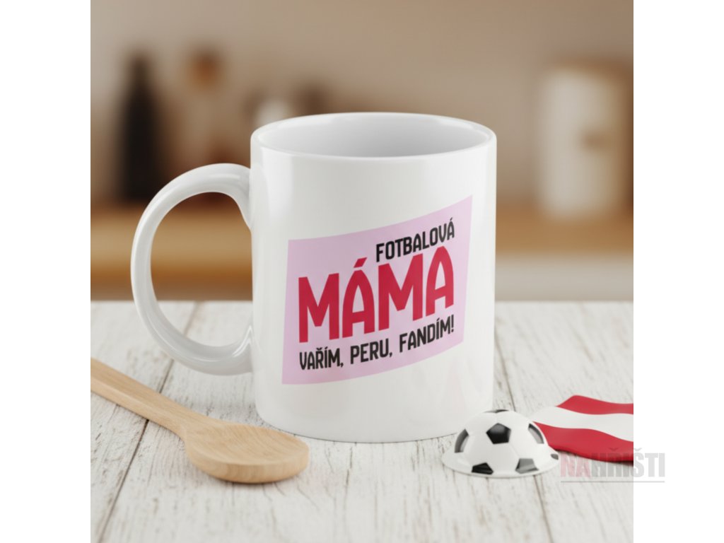 Hrnek „Fotbalová máma – vařím, peru, fandím!“ je ideální volbou pro všechny maminky, které stojí při svých malých i velkých fotbalistech. Originální růžová grafika s výrazným nápisem dává jasně najevo, že být fotbalovou mámou není jen o fandění, ale také o spoustě péče a lásky, která stojí za každým sportovním výkonem.