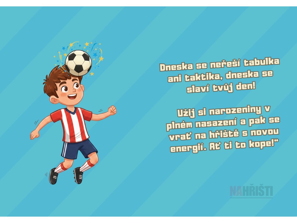 Narozeniny jsou jediný den v roce, kdy taktika ustupuje stranou a hlavní hvězdou zápasu je oslavenec. Toto hravé přání s ilustrací mladého fotbalisty v akci je navrženo tak, aby vykouzlilo úsměv na tváři a dodalo energii do dalších tréninků.