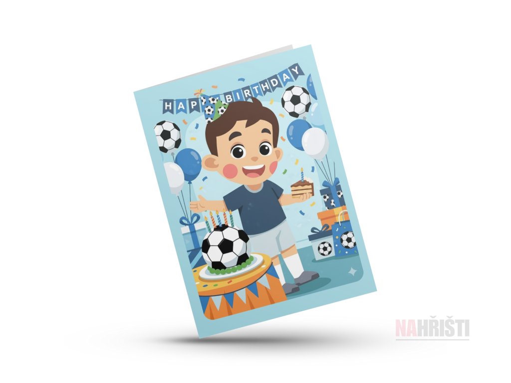 Veselé skládací přáníčko s kresleným fotbalistou držícím dort ve tvaru míče. Perfektní dárek pro každého, kdo slaví narozeniny a miluje fotbal.