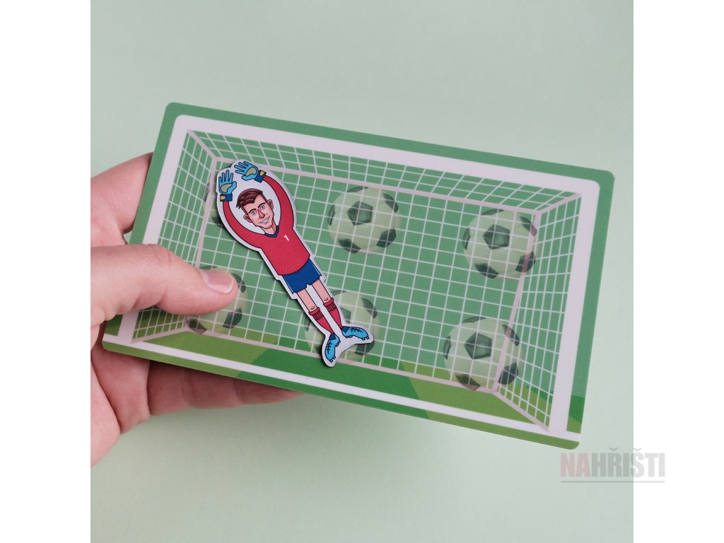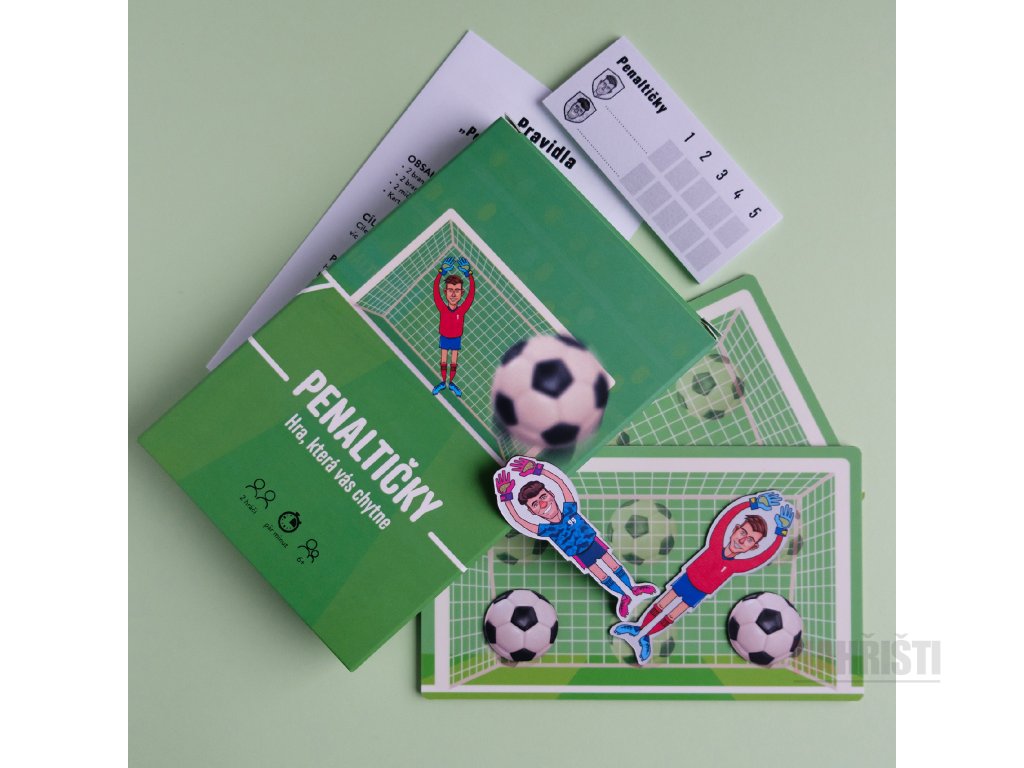 Hra PENALTIČKY – blesková karetní hra, která je naprostým hitem každé poločasové přestávky! Zapomeňte na nudu u reklam. Penaltičky jsou rychlé, napínavé a skladné, takže se dají hrát na konferenčním stolku i na koberci u televize. Ideální způsob, jak si s tátou nebo bráchou vystřílet vlastní vítězství, zatímco hráči v TV odpočívají v šatně.