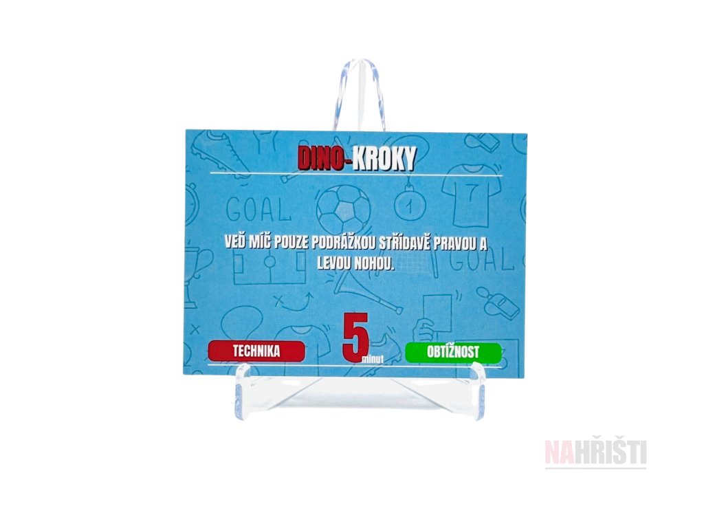 Děti si náhodně vytáhnou kartičku a plní úkol (např. „Dino-kroky“ – vedení míče podrážkou). Cvičení jsou krátká, úderná a barevná, aby udržela pozornost dětí.